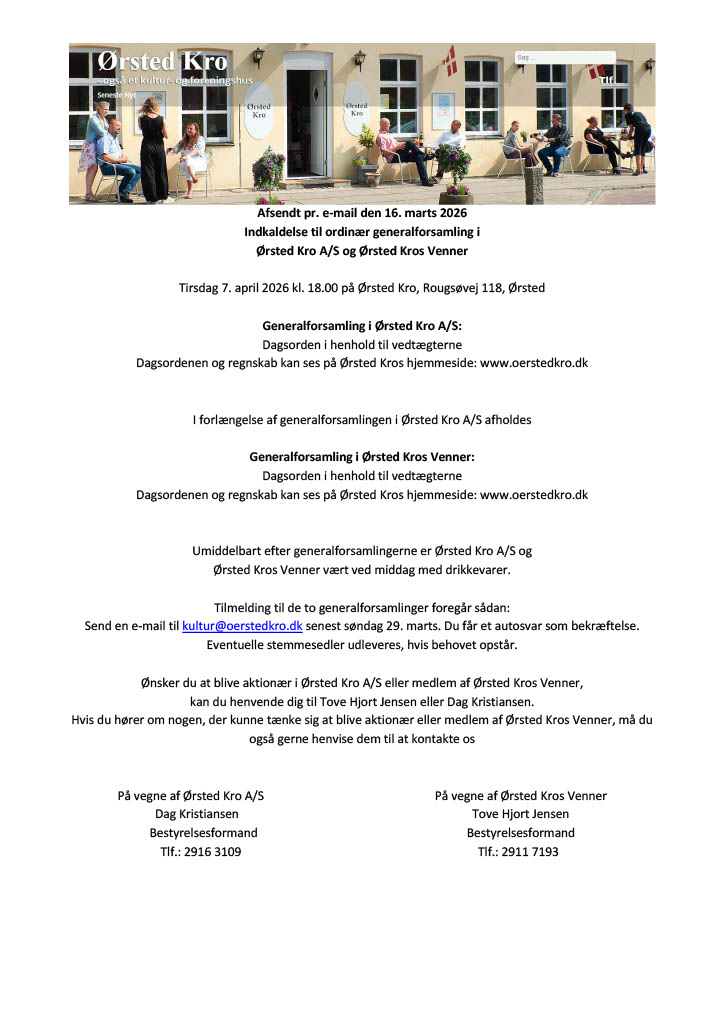 Det er blevet tid til årets generalforsamling i Ørsted Kro A/S og Ørsted Kros Venner